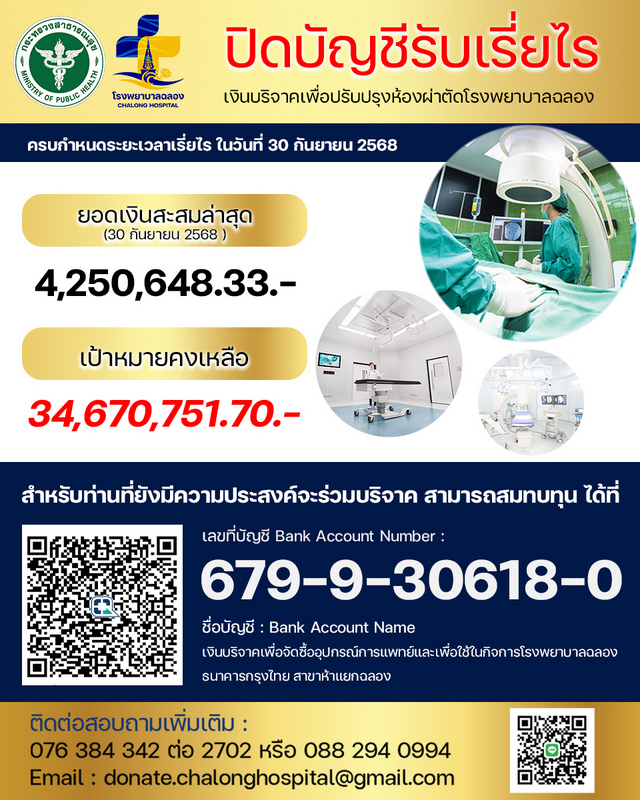 He added that Chalong Hospital plans to hold fundraising events to help bridge the remaining funding gap.