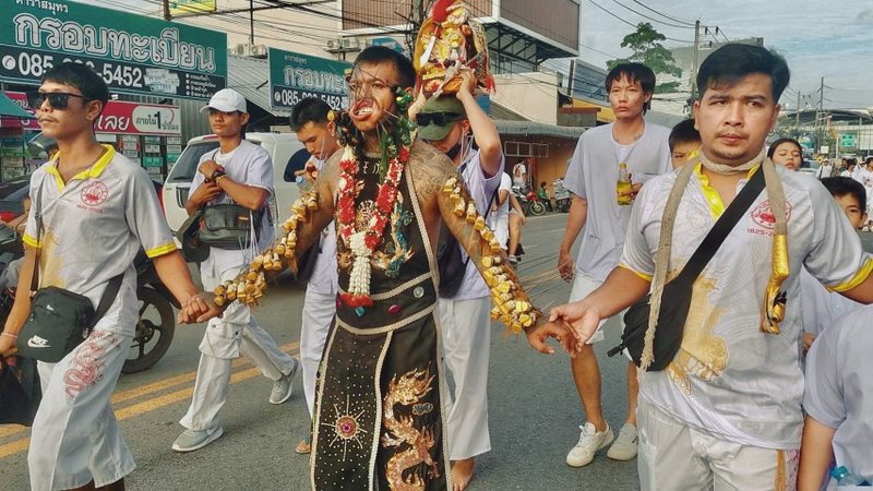 This year’s festival, however, has been notably subdued following a resolution agreed among shrine leaders to reduce noise and limit the use of large weapons by spirit mediums in a show of respect and mourning for Her Majesty Queen Sirikit The Queen Mother, who passed away last Friday (Oct 24).