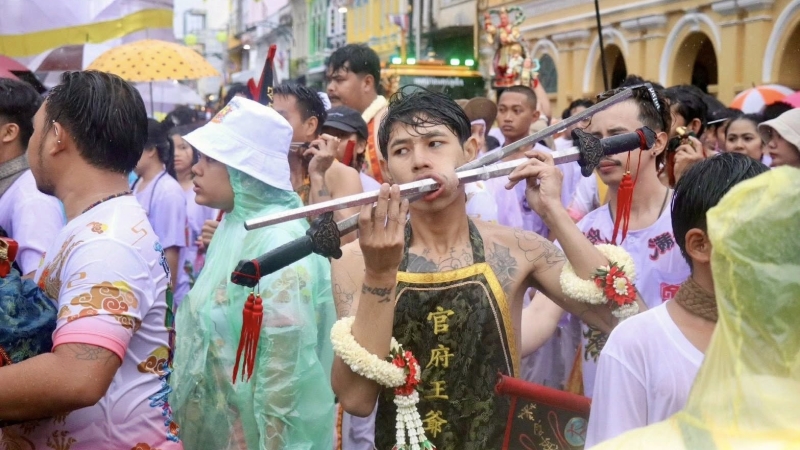 The morning’s processions began with Jeng Ong Shrine, located opposite Vachira Phuket Hospital, where spirit mediums entered trance and performed astonishing acts of devotion. Many had their cheeks and bodies pierced with swords, knives and other sharp objects in symbolic demonstration of faith and endurance.