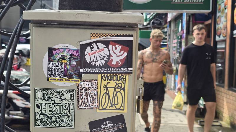 Police launched an investigation after the social media post went viral, leading them to Soi Bang Tao 2, where officers discovered several stickers printed with abbreviations for illegal substances including KOKC, MET, KET, LSD, MDMA, AMF, ONT, and MEF, alongside a QR code.