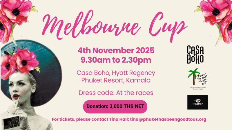 The fabulous Melbourne Cup Brunch is back at Casa Boho, Hyatt Regency Kamala Tuesday, 4th November · 9:30 AM – 2:30 PM • Free-flow drinks & brunch • Fashions on the Field with prizes for Best Hat, Best Dressed, Best Suited & Chicest Couple • Raffles & auctions • Live screening of the race that stops a nation • DJ with ocean views Casa Boho is the perfect brunch spot: air-conditioned, with ocean breezes and panoramic views across Kamala Bay. All proceeds go to Phuket Has Been Good To Us Foundation, funding free English education for disadvantaged children. Donation: 3,000 THB Tickets: tina@phukethasbeengoodtous.org Don’t miss this party with a purpose!