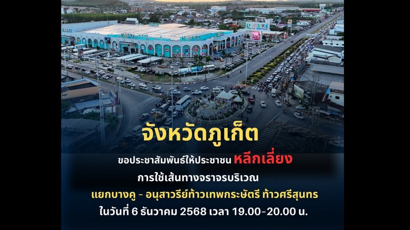 The announcement, posted publicly by the Phuket branch of the Public relations Department (PR Phuket) late yesterday (Nov 25), warned that traffic in the area is expected to be heavily congested during that period and recommended that drivers use alternative routes.