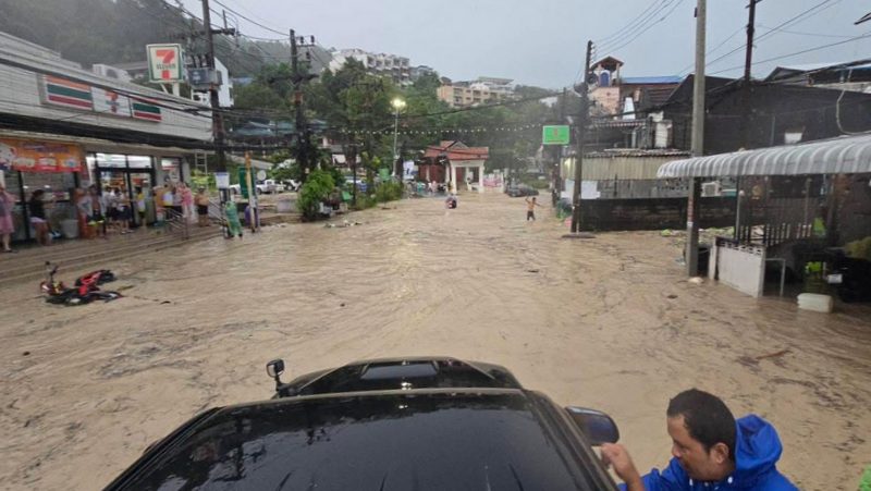 In Patong’s Baan Mon community, flash floods inundated homes and caused extensive property damage, with water levels rising rapidly through the evening as high tides compounded the situation.
