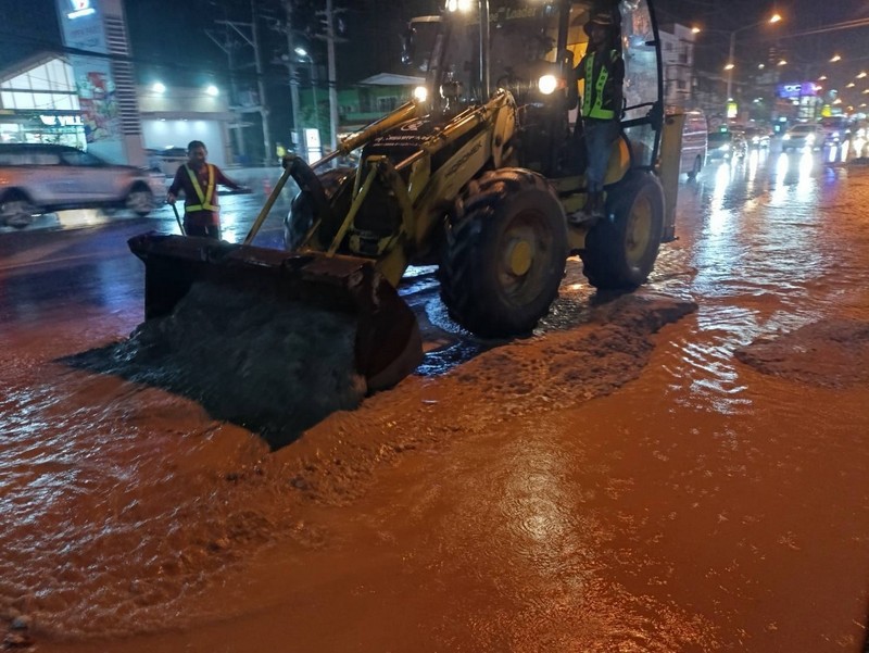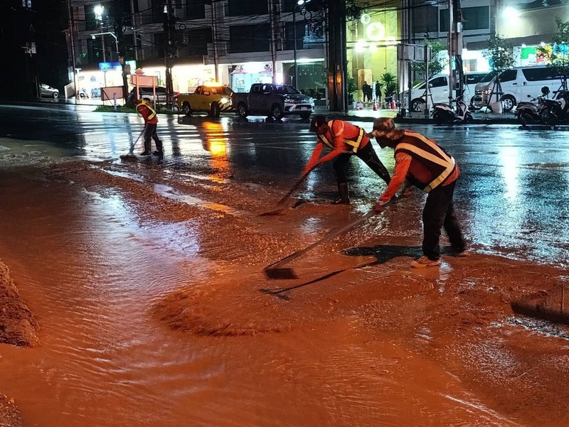 In Kamala, heavy rain washed soil from the Kamala–Patong Road expansion site onto the road surface near the Oceana Hotel at about 3:30pm, turning runoff water red with mud.