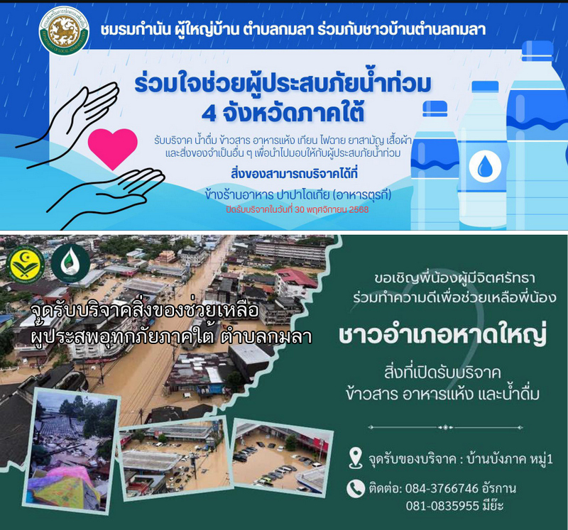 Residents of Baan Bang Phak, Moo 1, are also collecting rice, dried food and drinking water. Donors can contact 084-3766746 or 081-0835955 for information.