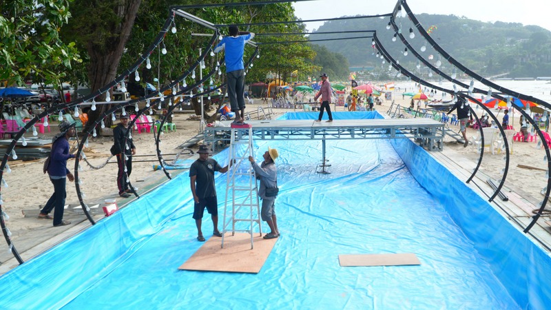 Patong Mayor Lalita Maneesri yesterday inspected construction of the temporary pond set up on the beach at the end of Bangla Rd, prepared to prevent krathongs from entering the ocean and reduce environmental impact.