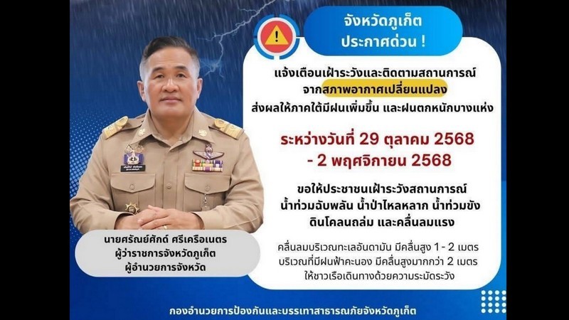 The notice, issued this morning by the Phuket Provincial Office, urges residents, businesses and visitors to closely monitor weather updates as the southern region braces for intensified rainfall caused by a strong low-pressure system moving across the Andaman coast.