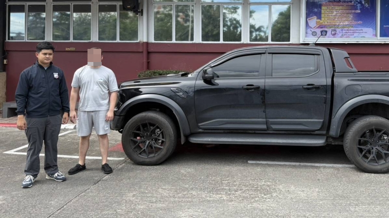 At 1:40pm yesterday (Sept 26), Pol Lt Col Kan Aksornthong, Investigation Superintendent at Phuket City Police, formally received the 25-year-old Russian national whom police named only as ‘Mr Alex’ and the black Ford pickup truck used in the video in front of Phuket City Police Station.