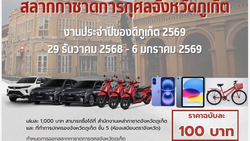 Hosted under the title ‘Phuket’s Best Products and New Year’s Fair 2026’, the event aims to raise funds to support relief efforts for people in need across the province. Tickets are available from government offices and selected private outlets.