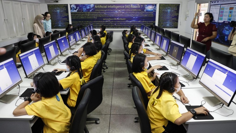 Students take part in the ‘Edsy AI Speaking Coach’ project, which introduces the use of AI, at a school in Bangkok, Feb 20, 2024. Photo: Pattarapong Chatpattarasill / Bangkok Post